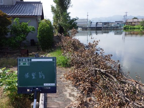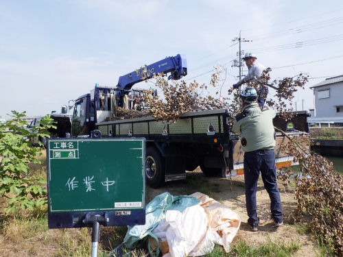 作業場所が狭く重機などは入れるスペースが無い状況で陸地側からと河川側からで連携を取り、作業を行いました。
